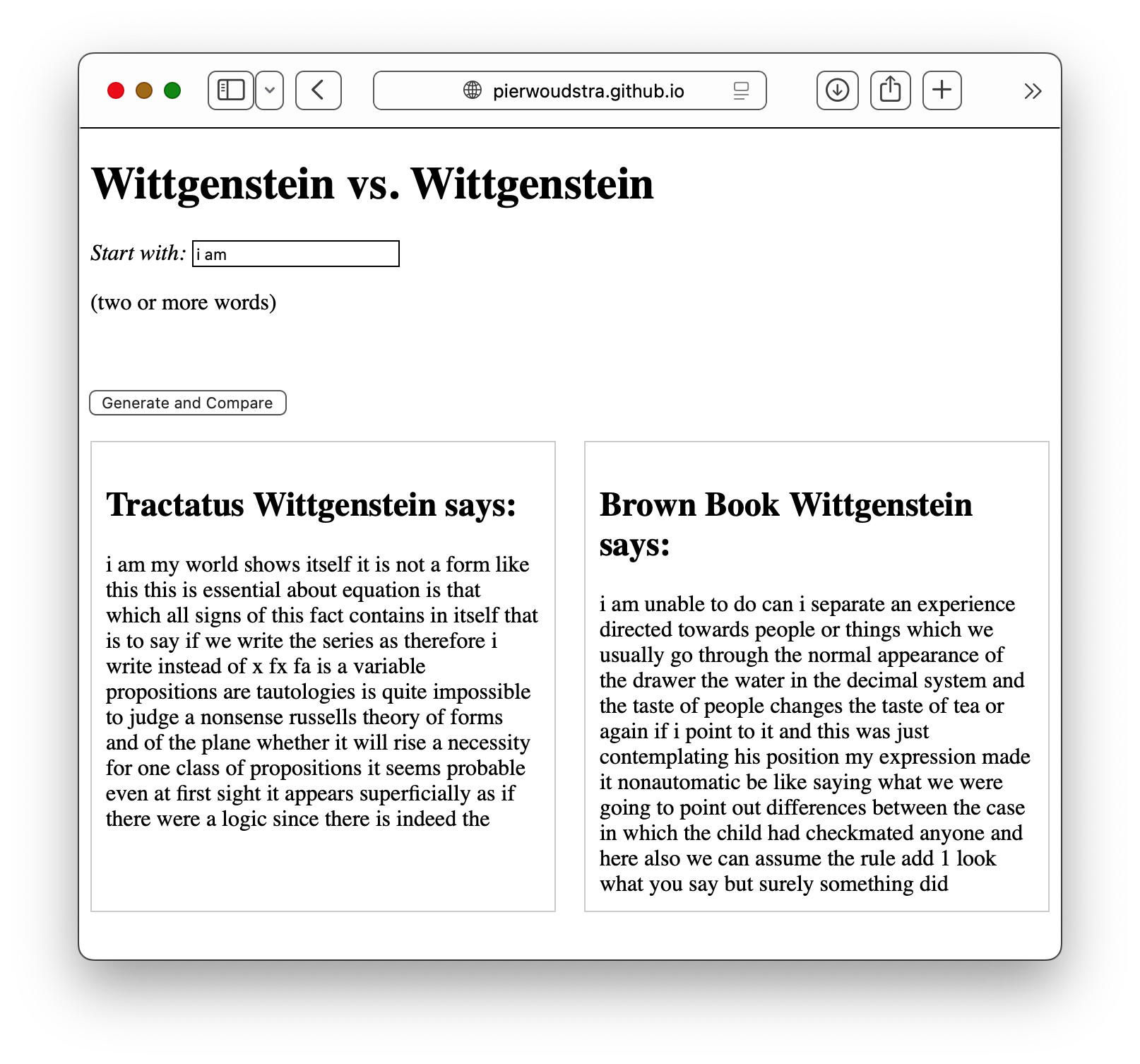 The text is generated using his two main works: the Tractatus Logico-Philosophicus and the Philosophical Investigations.